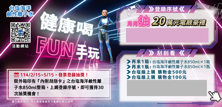凡購買台塩海洋鹼性離子水全系列商品任一瓶 ( 850ml、1500ml、600ml、420ml、2000ml ),上活動網站輸入發票號碼,上活動網站輸入發票號碼,即可參加月月抽,月月FUN送20萬元電競豪禮!